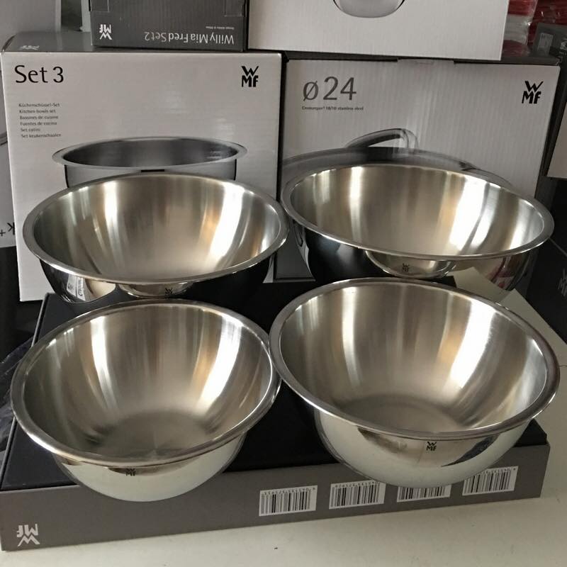 Tuyển đại lý bán buôn, CTV trên toàn quốc -------------------------------------- ️ Bộ âu WMF Gourmet gồm 4 chiếc âu với các đường kính và dung tích: 1 âu Ø 16cm (0,75l); 1 âu Ø 18cm (1l); 1 âu Ø 22cm (2l); 1 âu Ø 24cm (2,75l). ️ Được thiết kế theo công nghệ độc quyền Cromagan đảm bảo an toàn tuyệt đối khi tiếp xúc đồ ăn ở nhiệt độ cao và không bị oxi hóa khi tiếp xúc hóa chất ️ C️ó thể sử dụng trong lò nướng, nồi hấp. Đặc biệt có thể sử dụng đun trên bếp kể cả bếp từ. ️ Cực kì dễ dàng vệ sinh và sạch sẽ hơn rất nhiều so với âu nhựa. An toàn với máy rửa bát. ------------------------------------------