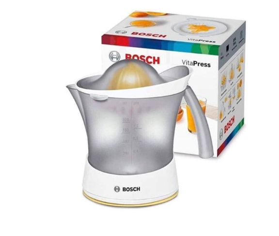 Máy vắt cam Bosch MCP3000 25w có kiểu dáng nhỏ gọn, tiện dụng cùng màu trắng tinh tế, đẹp mắt mang đến vẻ đẹp hiện đại cho không gian nhà bếp. Để vắt cam bạn chỉ cần đặt cam vào đúng vị trí và ấn xuống là máy sẽ tự động vắt và nhấc tay lên thì máy sẽ ngừng hoạt động.