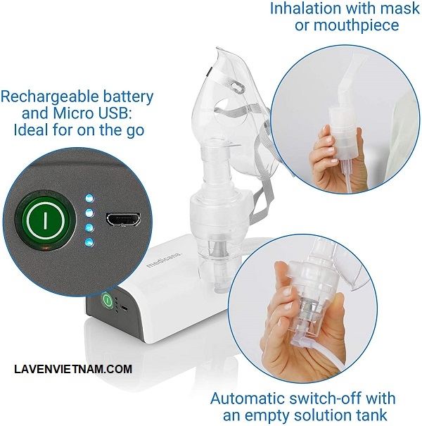 Máy xông mũi họng Medisana IN605 có thể dùng cầm tay, thuận tiện khi di chuyển, máy khú dung dạng nén khí có ống ngậm và mặt nạ thở cho người lớn và trẻ em, dùng để chữa cảm lạnh hoặc hen suyễn với pin sạc qua micro USB.