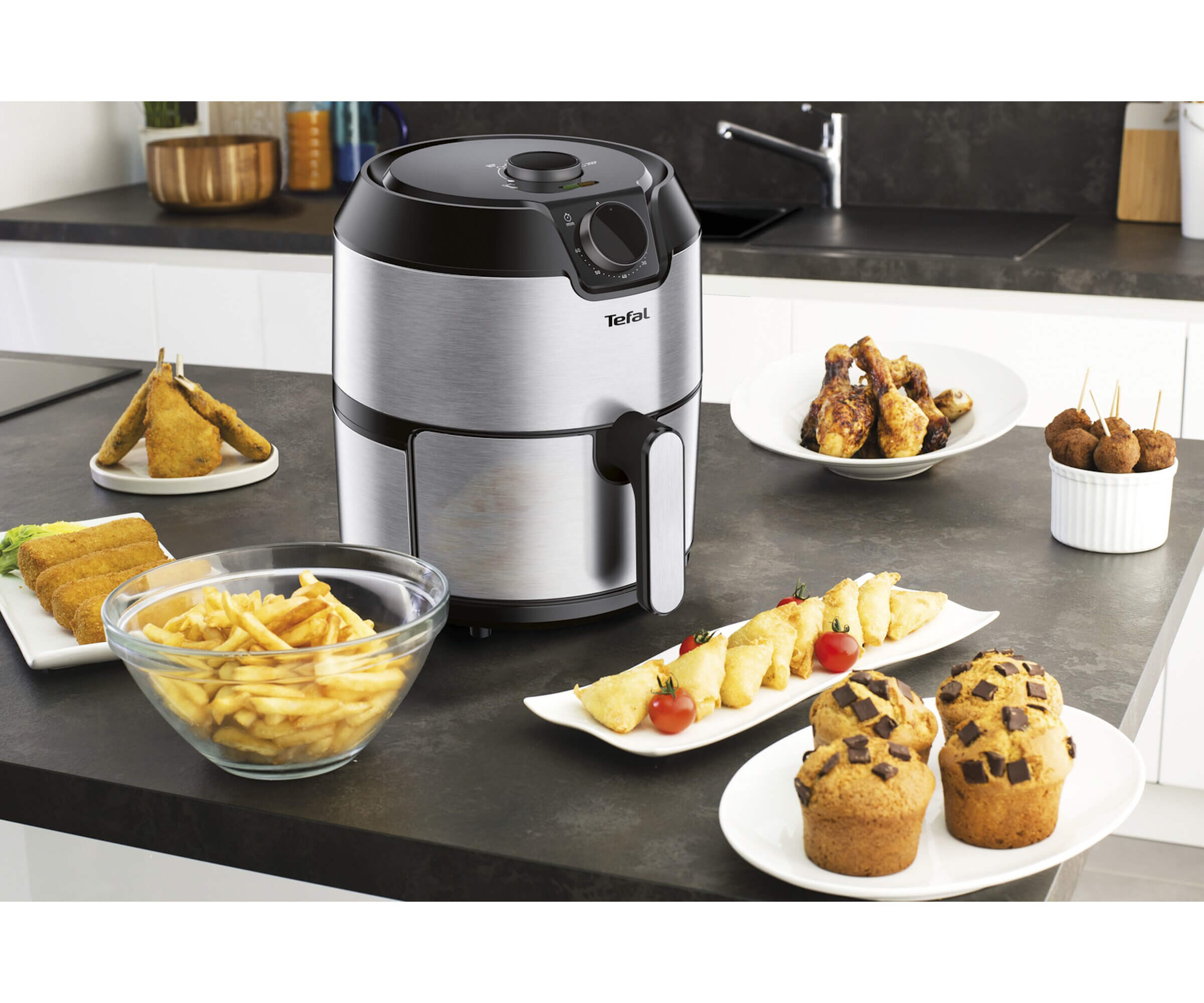 Nồi chiên không dầu Tefal EY201D ️ Nồi chiên không dầu Tefal EY201D được thiết kế với kiểu dáng hiện đại, gam màu sang trọng, kích thước nhỏ gọn, phù hợp nhiều không gian bếp khác nhau. Công suất hoạt động 1400W mạnh mẽ, giúp làm chín nhanh mà không tốn điện. ️ Nồi có kích cỡ XL, sức chứa 1.2 kg thực phẩm, đáp ứng nhu cầu sử dụng từ 4 - 6 thành viên gia đình. ️ Công nghệ luân chuyển khí nóng 3D giúp đồ ăn trong ngọt ngoài giòn, tốt cho sức khỏe vì chiên nướng không cần hoặc cần rất ít dầu. ️ Có 8 chương trình nấu được lập trình sẵn cho bạn lựa chọn dễ dàng và phù hợp với từng món ăn như khoai tây chiên, sườn, tôm, nướng bánh, pizza, cá, bít tết, thịt gà. Việc của bạn là chọn công thức nấu và bấm chọn là xong, đợi nồi nấu xong sẽ có chuông báo, vô cùng tiện lợi, không cần phải chờ đợi. ️ Bộ kiểm soát nhiệt độ, dễ dàng cài đặt nhiệt độ theo nhu cầu (từ 80°C đến 200°C). Bộ hẹn giờ lên đến 60p ️ Lòng nồi thiết kế rộng, phủ chống dính, dễ dàng vệ sinh sau khi sử dụng. Ngoài ra, bạn có thể tháo rời các khay của nồi chiên Tefal và rửa trong máy rửa chén, tiết kiệm thời gian hơn rất nhiều. ️ Thông số kỹ thuật: Điều khiển cơ đơn giản, dễ dàng; Công suất: 1400W; Kích thước: 27.8 x 33.8 x 33.3 cm ----------------------------------------