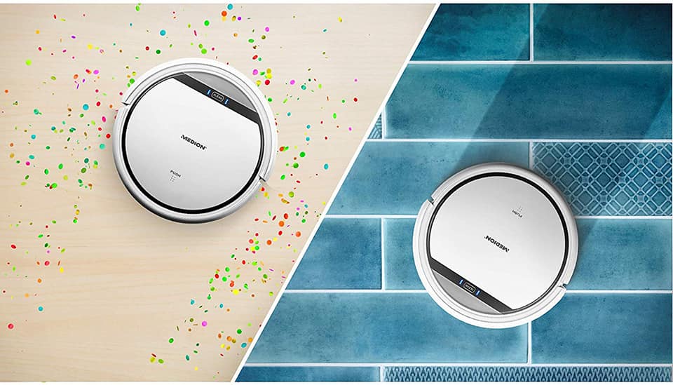 ️ Hoạt động hiệu quả trên nhiều loại sàn: sàn gỗ, thảm, sàn gạch…, thậm chí bạn có thể đặt robot Medion MD18500 trên bàn, ghế sofa. Thiết bị nhỏ gọn dễ dàng hút sạch bụi bẩn và lau sạch ở những nơi ẩm thấp như gầm giường, gầm tủ